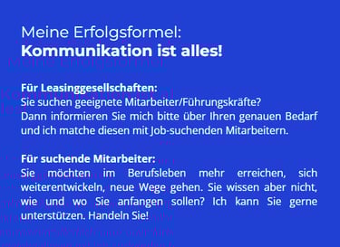 Ich unterstütze heute in Kooperation mit der "DESTINATION GmbH & Co. KG Unternehmens- Personal und Karriereberatung" (die Nr. 1 der Personal-Gesellschaften für Leasing / seriös, kompetent und erfolgreich!) sowohl die Finanzdienstleistungs-Unternehmen bei der Suche nach geeigneten Mitarbeitern und Führungskräften als auch die Mitarbeiter/Suchenden selbst bei ihrer Karriere-Planung und -Gestaltung. Mein Ziel ist es, diejenigen zusammenzubringen, die zusammenpassen und -gehören.